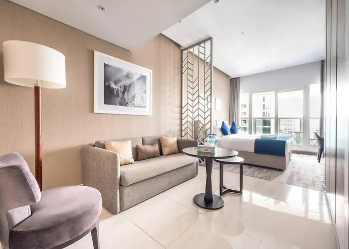 Ces propriétés Studio Apartment In Damac Maison Prive Business Bay - High Floor comprend un balcon et un coin salon avec une climatisation pour un plus grand confort. L'immeuble comprend 1 chambre à coucher à coucher. La pièce possède 1 salle de bain. Vous trouverez également un sèche-cheveux et des draps de bain.